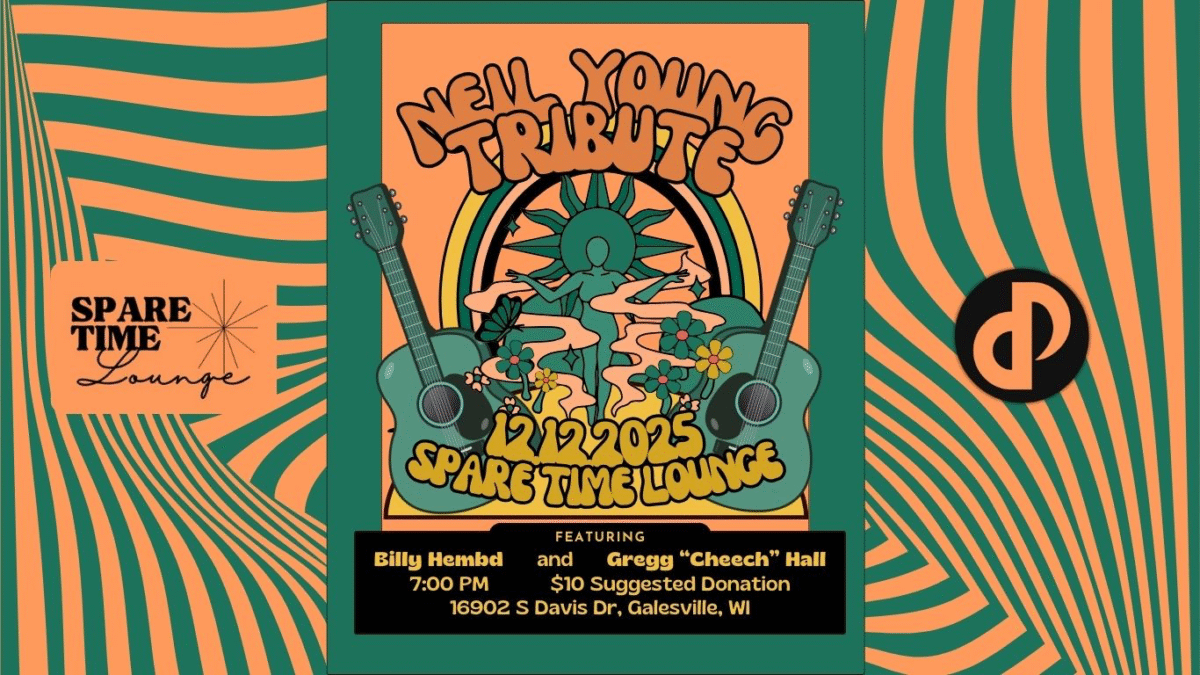 Spare Time Lounge 16902 S. Davis Dr, Galesville, United StatesSpare Time Lounge & Deece Productions Present: A Neil Young Tribute Night! Join us for an unforgettable evening featuring Billy Hembd and Gregg “Cheech” Hall, performing the timeless music of Neil Young! Friday, December 12th, 2025 7:00 PM $10 Suggested Donation Spare Time Lounge16902 S. Davis Dr, Galesville, WI Great...
