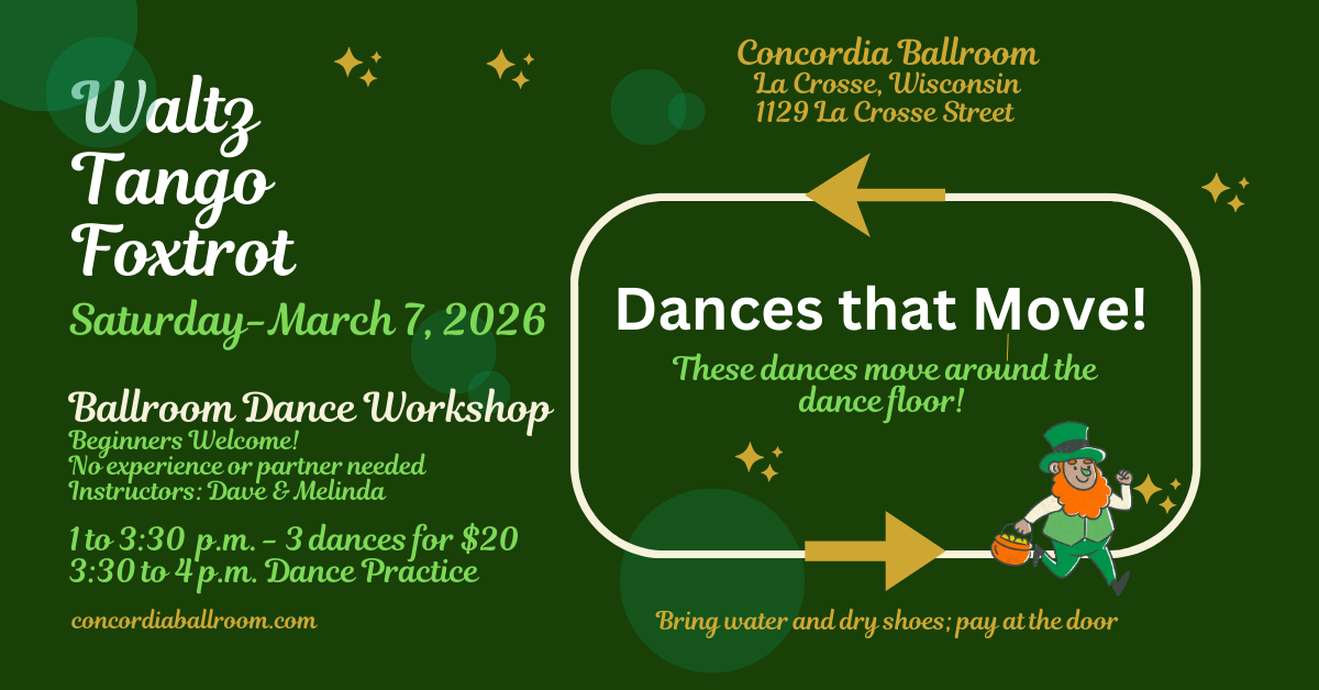 Join us at the Concordia Ballroom on Saturday, March 7, from 1 to 3:30 pm for a beginner ballroom dance lesson focused on the waltz, tango, and foxtrot. Dance practice from 3:30 to 4 pm. These dances move around the dance floor to get YOU moving! No partner or experience needed. $20 per person. Bring water and dry shoes; pay at the door. Instructors: Dave and Melinda.