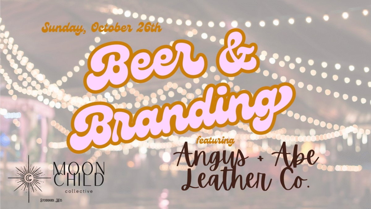 FREE beer, $5 branding by Moon Child Collective, and Angus + Abe Leather Co will be here popped up with TONS of great leather goods! Possibly some live music?