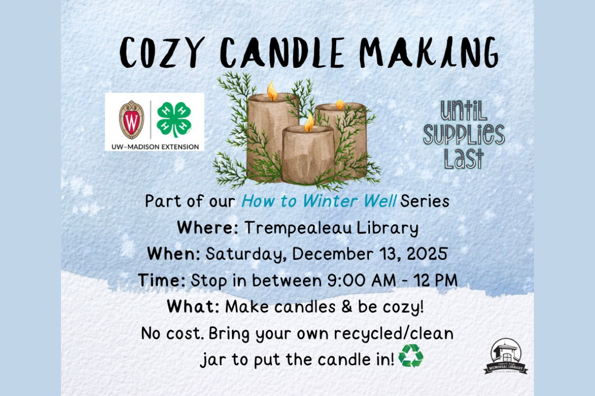 Make candles & be cozy! Andrea from UW-Extension Trempealeau County will be there to assist you choose a color and scent. Bring your own recycled/clean jar to put the candle in! No cost. While supplies last!