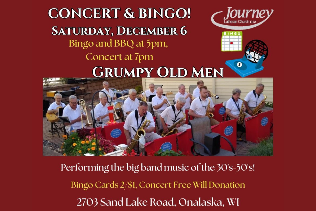 The Grumpy Old men will be performing the big band music of the 30s-50s at Journey Lutheran on Saturday, December 6th. The concert starts at 7 pm. Join us beforehand for bingo and a sloppy joe meal, starting at 5 pm. Free will donations will be accepted for the concert.