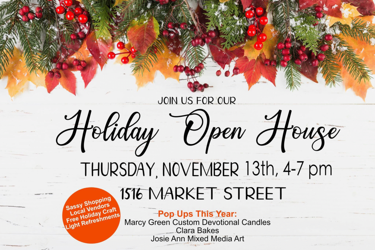 Holiday open house! Join at the shop for sassy shopping, local vendors, a free holiday craft, and light refreshments! Pop Ups this year: Marcy Green Custom Devotional Candles, Clara Bakes, Josie Ann Mixed Media Art.