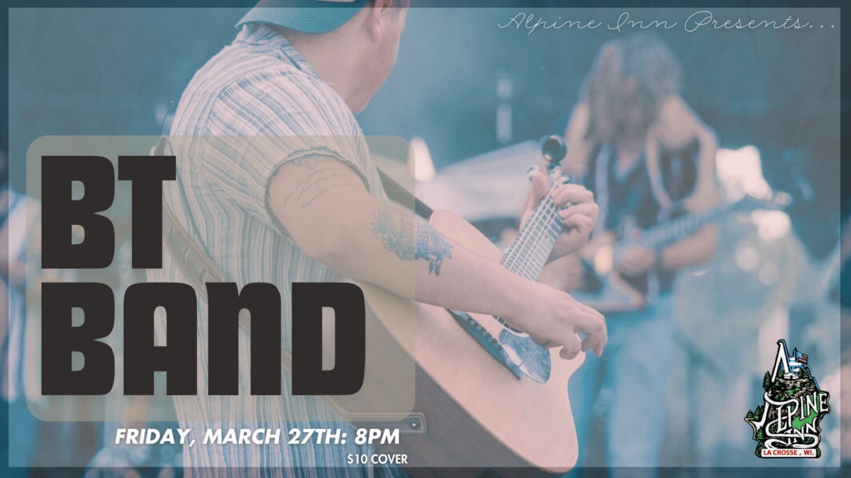 Join us on Friday, March 27th for the re-introduction of BT Band! Bryce and the guys will be debuting newest member Sam Baudek as the new bass player and will have an awesome revamped set list to show off- you will not want to miss this show! $10 cover