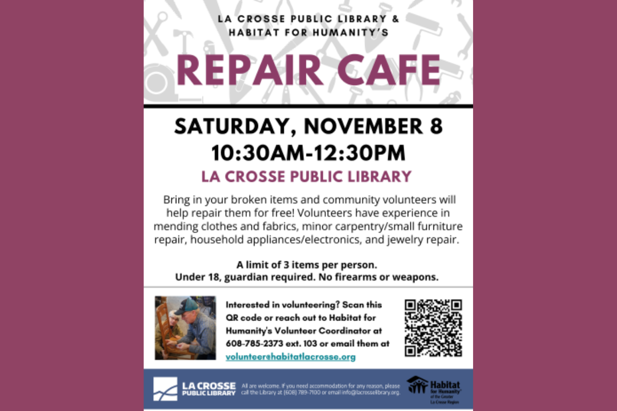 Join the La Crosse Public Library with Habitat for Humanity for our Repair Cafe! Bring in your broken items and our volunteers will teach you about minor repairs and will help repair them for free. Volunteers have experience in mending clothes and fabrics, minor carpentry/small furniture repair, household appliances/electronics, and jewelry repair.