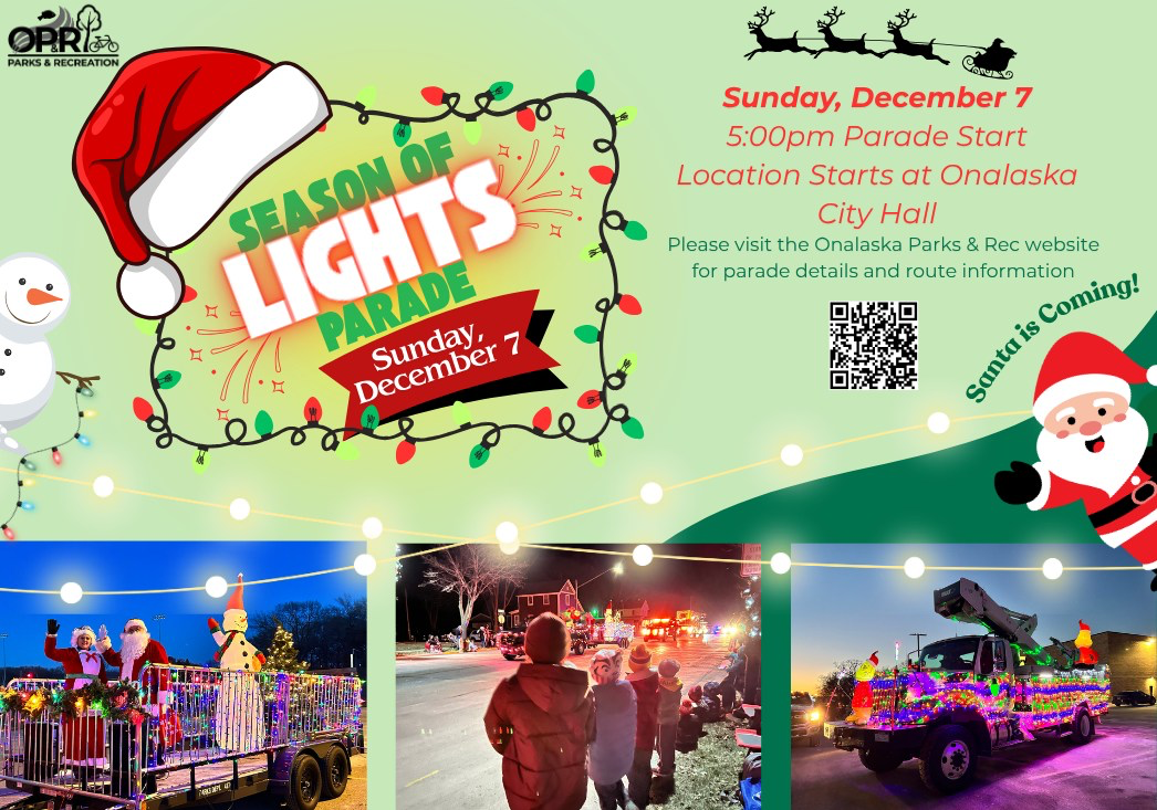 The City of Onalaska is thrilled to host our 5th annual Season of Lights holiday parade on Sunday, December 7th at 5:00pm. Join us as we light the streets of Onalaska with our festive parade – filled with local businesses, floats and groups – all decked out in holiday lights and décor! We even hear Santa will be in the parade! We hope to see you there!