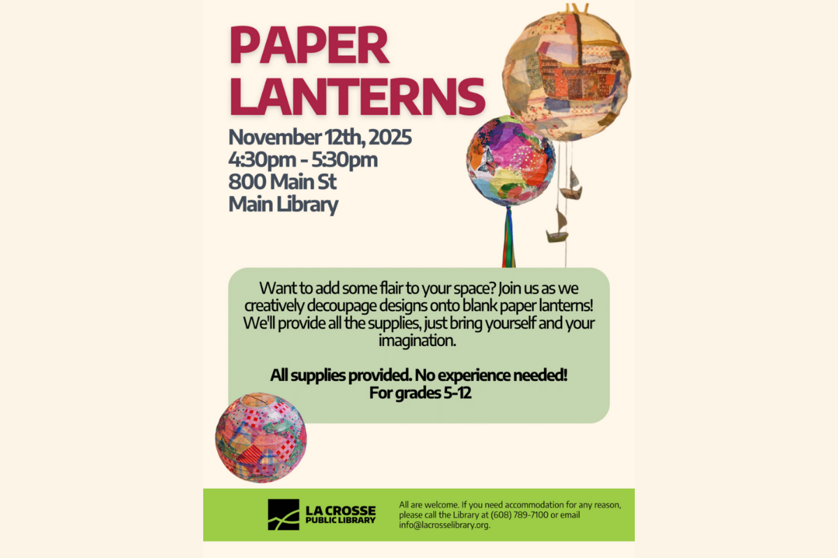 Want to add some flair to your space? Join the La Crosse Public Library as we creatively decoupage designs onto blank paper lanterns! We’ll provide all the supplies, just bring yourself and your imagination. No experience needed!