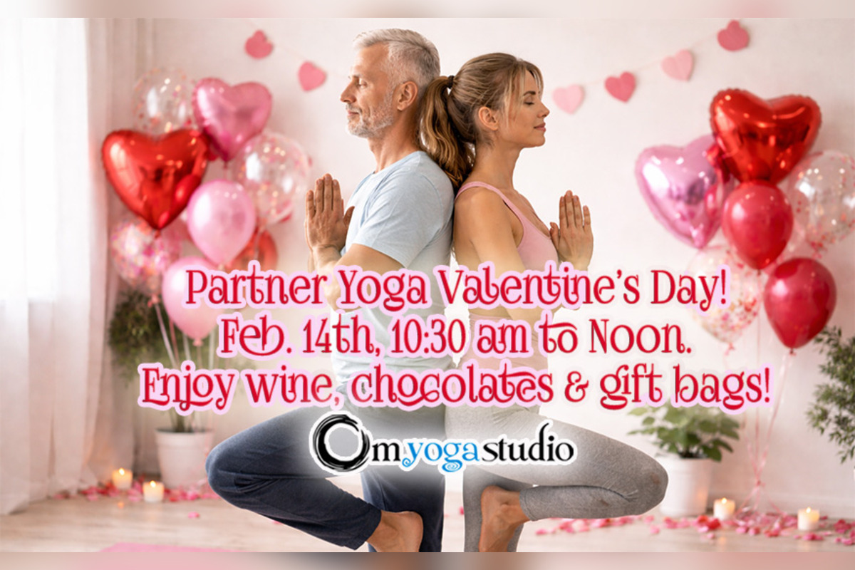 Bring your spouse, partner or friend for Partner Yoga @ Om Yoga Studio. Connect, encourage, support, and laugh. Enjoy Wine, Coffee & Chocolates along with a gift bag to celebrate you and Valentines
