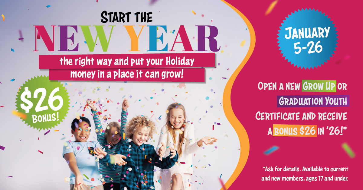 Happy New Year from Altra Federal Credit Union! Give holiday money a head start in the new year. Open a new Grow Up or Graduation Youth Certificate and receive a $26 bonus in ’26, available January 5th through January 26!