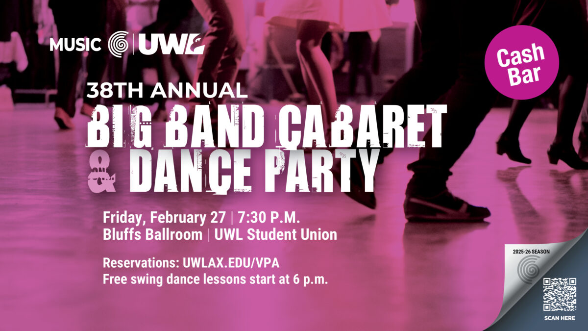 38th Annual Big Band Cabaret & Dance Party Friday, February 27, 7:30 p.m. Bluffs Ballroom, UWL Student Union Free Swing Lessons begin at 6 p.m. Advance reservations highly recommended for immediate seating upon arrival. $20 recommended donation for Adults $18 recommended donation for Seniors $10 recommended donation for students. Reserve...