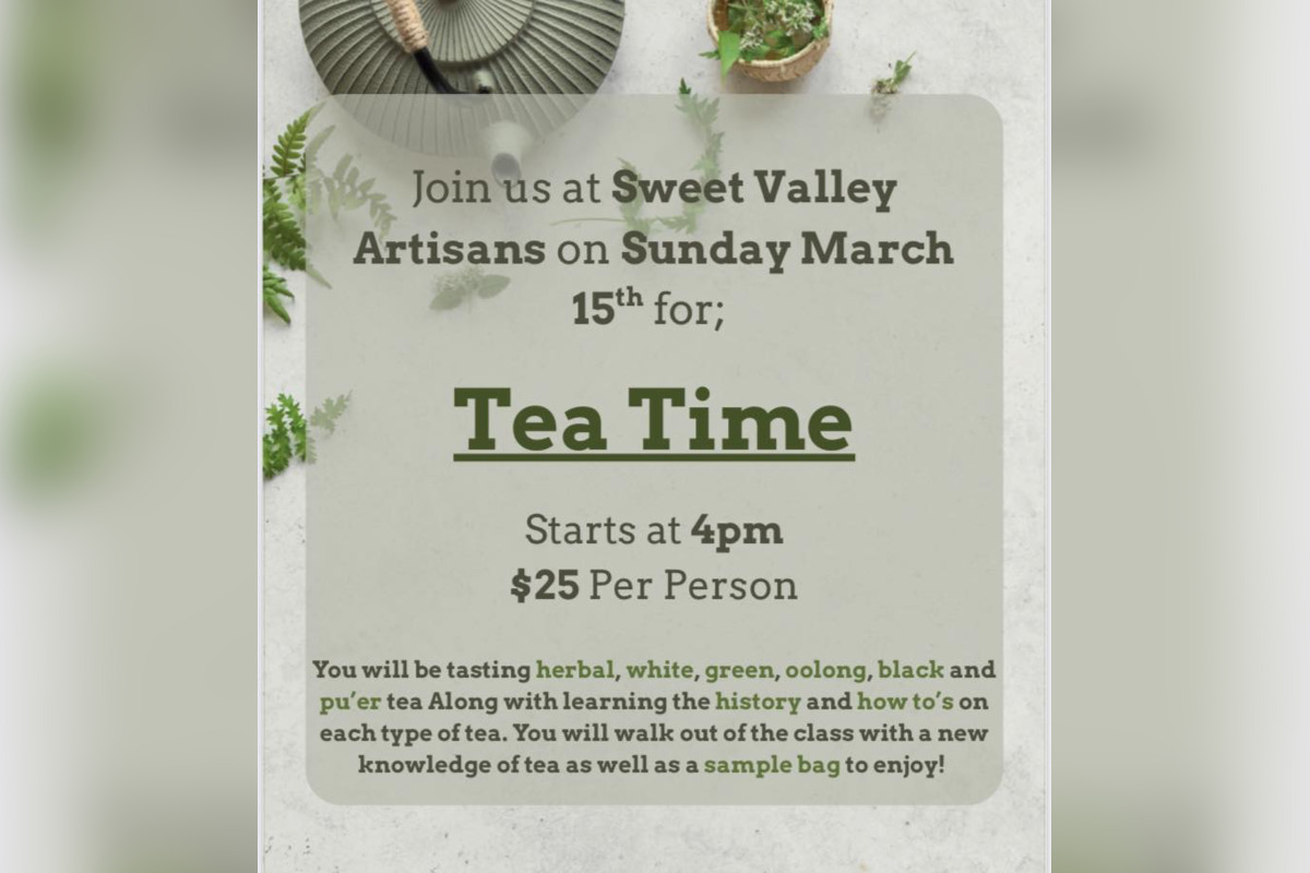 Join us right here at Sweet Valley Artisans on Sunday, March 15 for Tea Time! We will be tasting various kinds of teas, along with the various history of tea culture across the globe. Take home both the knowledge of tea as well as a sample bag to enjoy. Starts...