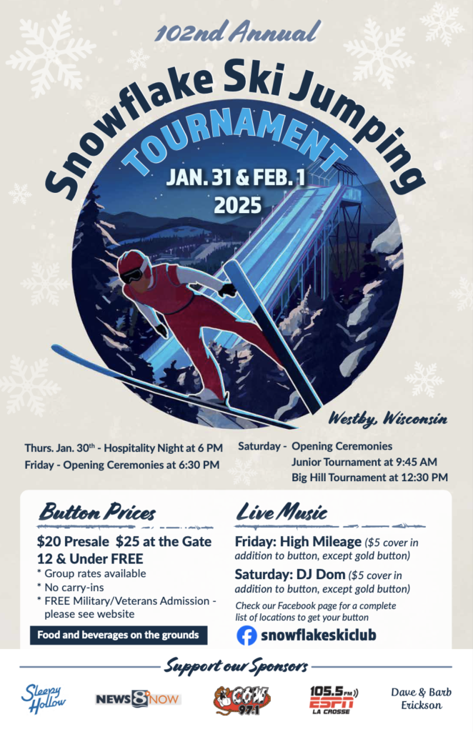 Join thousands of spectators and enjoy a whole weekend of fun at the Ski Jump Tournament! This year, there will be international ski jumpers from the US, Norway, Poland and Slovenia at the tournament. Ski Jumpers compete by going down the jump, oftentimes surpassing 50 miles per hour and flying hundreds of feet! Food and beverages are available for purchase at the winter festival grounds, and there’s live music, too! Please note there’s a $5 cover in addition to the button purchase in order to attend the music.